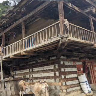 Smoke emanates from one of the many houses on a sloped narrow path in the village, in a single circling stream to the blue early afternoon sky above, leaving an oaky hugging warmth lingering in the air, a smell reminiscent of the mountains for those who dwell in the plains. The snow that fell a fortnight ago has settled in patches in little havens of shade, where the sun seldom visits, leaving a slurry of water and mud in places making for treacherous walking. The source of the smoke is a one story structure with a pent-and-gable slate shingles roof to protect against snow, sleet and heavy winds; dry masonry and wooden beams form the base structure with no cementing, woven together for strength against the seismic temperament of the terrain. A projecting balcony with a wooden railing on the first floor, intricate unique designs adorning its wooden beams and panels, overlooks the modest yard, where a couple of cows chew in silence through their day's share from the stack of hay that they need to sustain through the harsh Himalayan winter, that is only at its onset. A calf sits on a little blanket of hay in a corner, looking animatedly at life passing by with an infantile curiosity, it's tail flapping subconsciously at the resident flies. In an opening in the structure on the right, next to the cattle, lie stacks of neatly arranged twigs and branches of wood, the sole fuel for the house, for cooking and heat, collected by the axe wielding ladies through the year from nearby forests, hauled home on the back in conical baskets that once used to be made of wood but now are available in plastic and a variety of colors and sizes - convenience and consumerism has managed it's way up the hills. This house projects beauty in practicality over design, one of the last few standing Kathkuni structures between a line of new generation houses - painted in pink, green and of other bright hues - that have succumbed to the economy in scale of brick, mortar and cement.